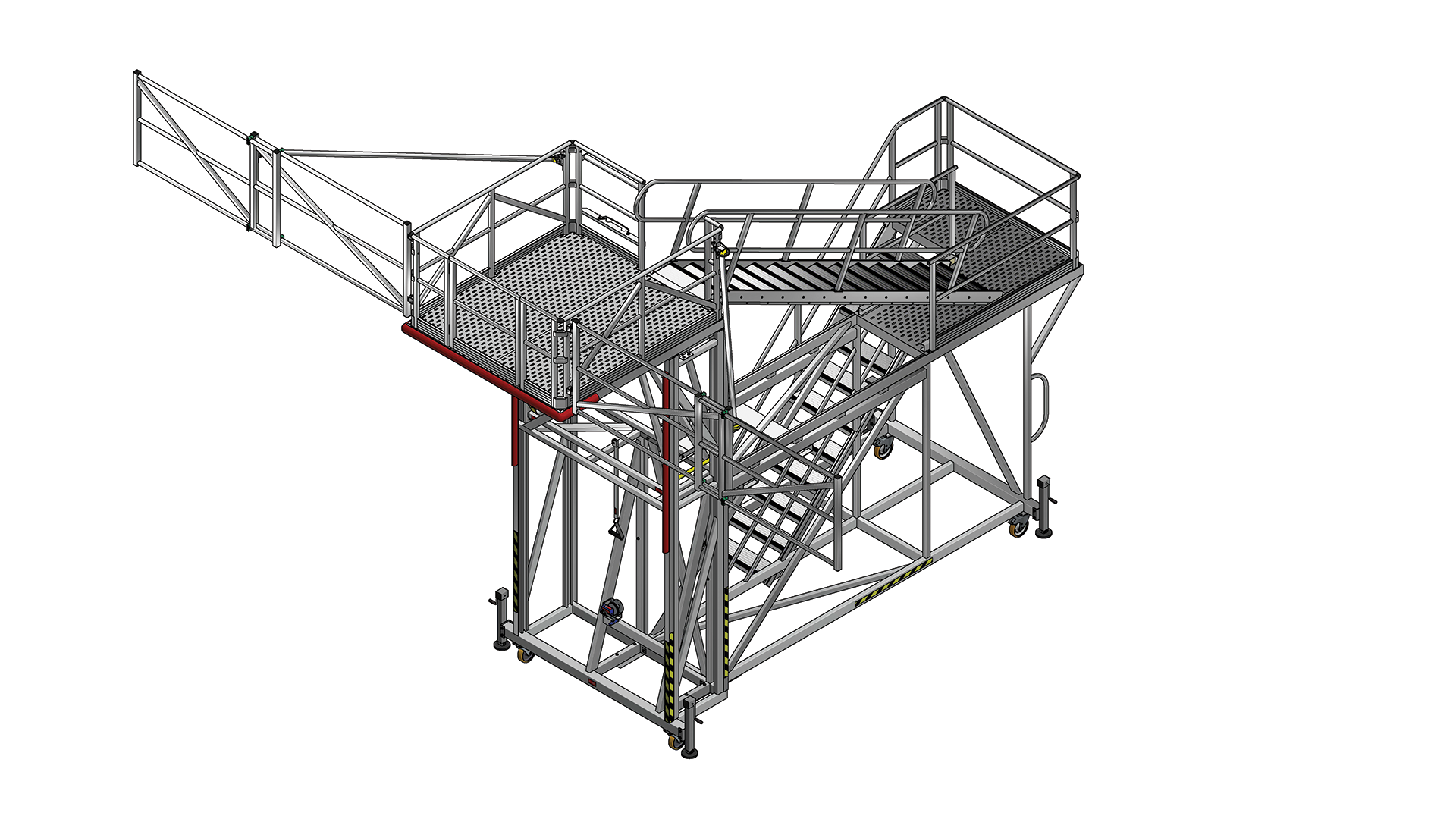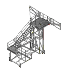 This is a height adjustable work platform with telescopic folding edge protection wings for direct access into the back of Haul Truck Trays.