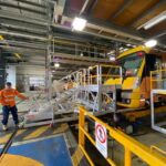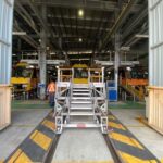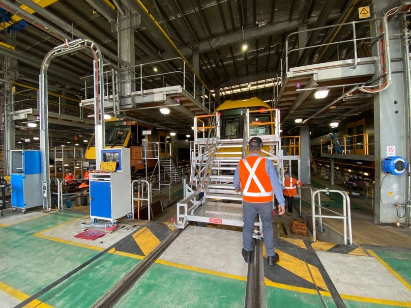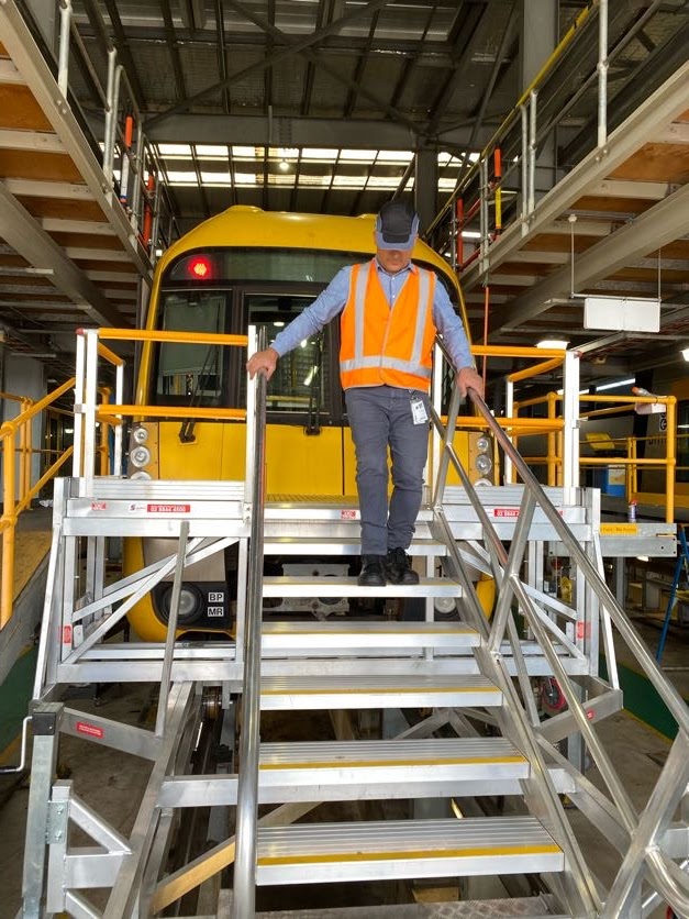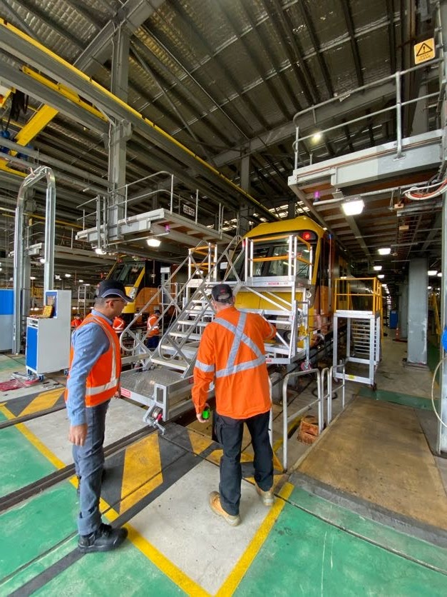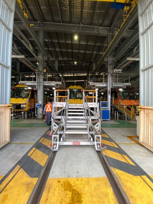 The height adjustable front of train access platform is a unique solution for allowing access to all areas of the front of trains, including; windscreen, windscreen wipers, external destination display, headlights and hornwell area.