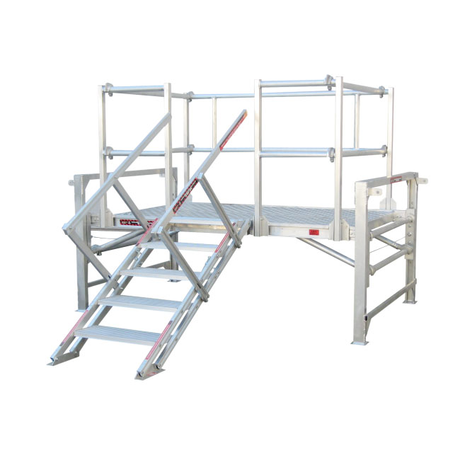 We design in-house, directly with the client, and build many solutions from high-grade aluminium – compliant with regulatory OSHA standards. This oil rig platform features height adjustability (0.3-1m), self-levelling stairs for accommodating different height ranges and towing lugs for easy transporting around the rig. This platform also has a 495lbs weight rating.