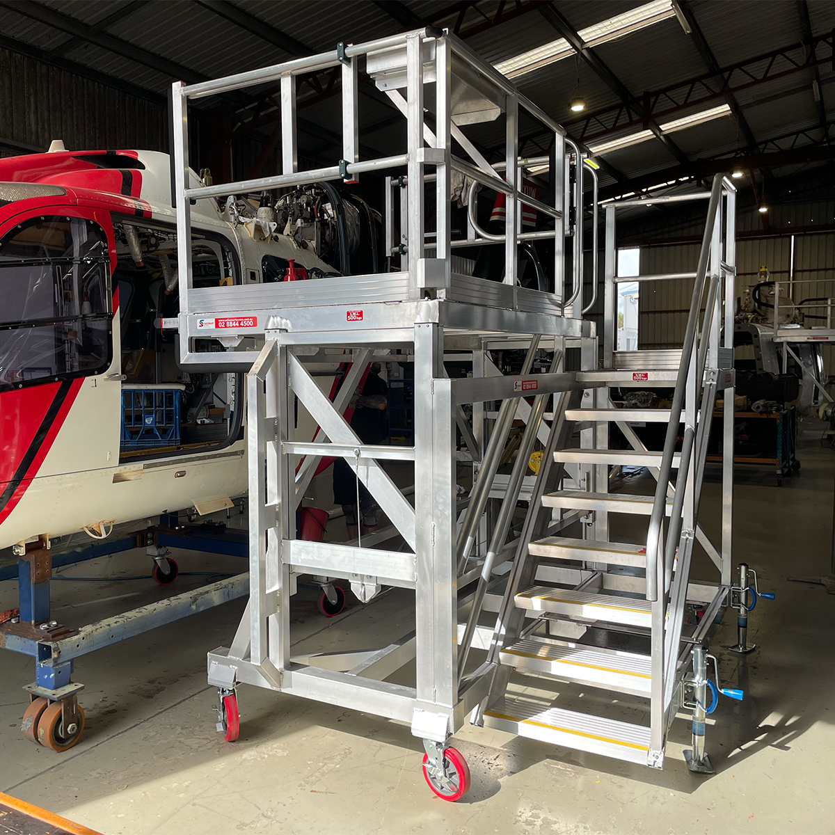 Constructed from high-tensile, T6 marine-grade aluminum box section, RotoReach offers unmatched strength and corrosion resistance, making it ideal for both indoor hangars and outdoor flightlines. The 90” x 48” platform provides a spacious, secure work area with a self-closing gate and full surround guardrails, allowing for maximum mobility and fall protection while working at height.
