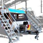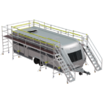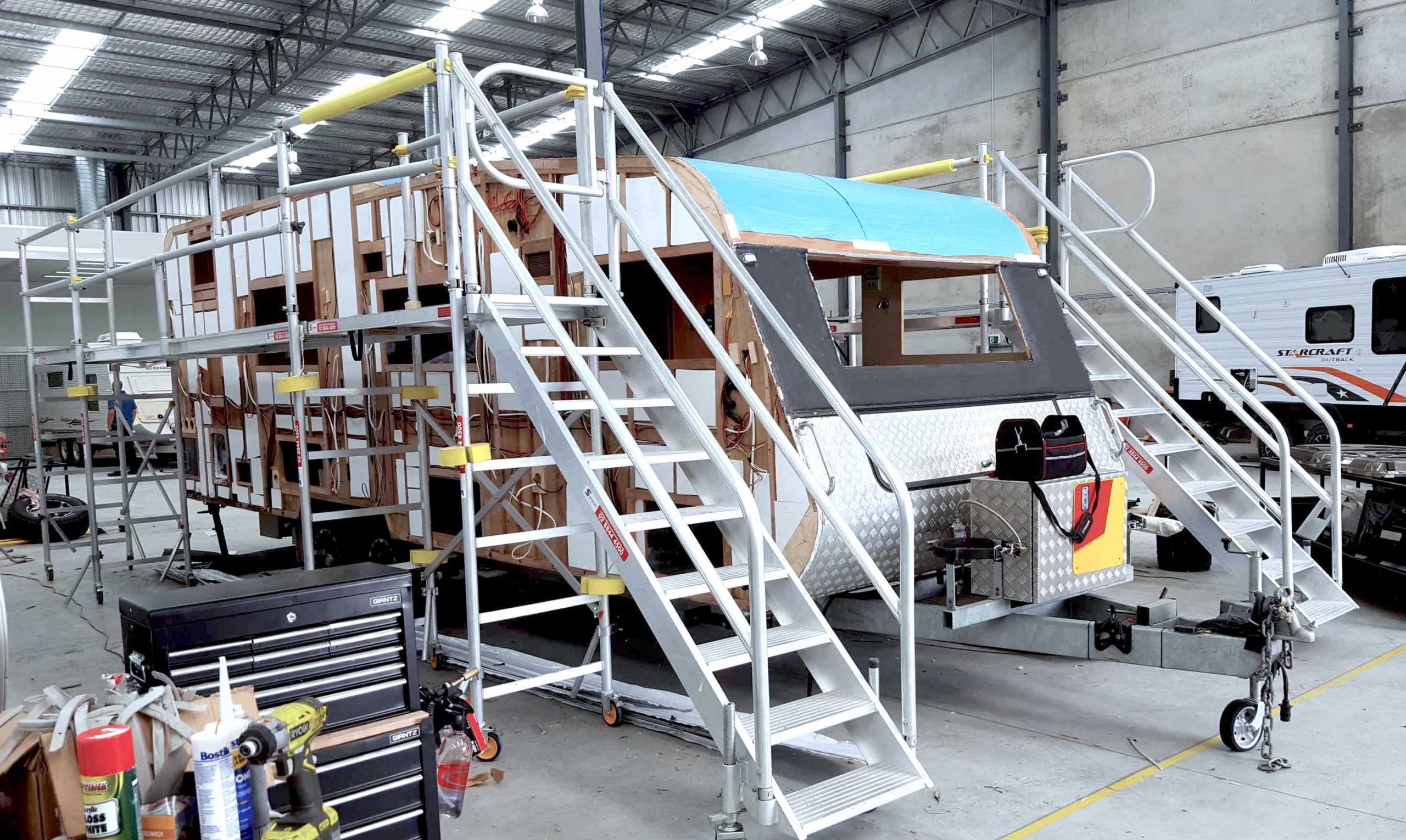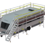 Utilising the proven components of our Mini Mobile system, including custom stairs, longboard packs, and corner packs, the U-Shaped Vehicle Access Platform seamlessly creates two side platforms and a rear joining platform. This configuration provides optimal accessibility and manoeuvrability, allowing workers to efficiently carry out caravan builds with ease.